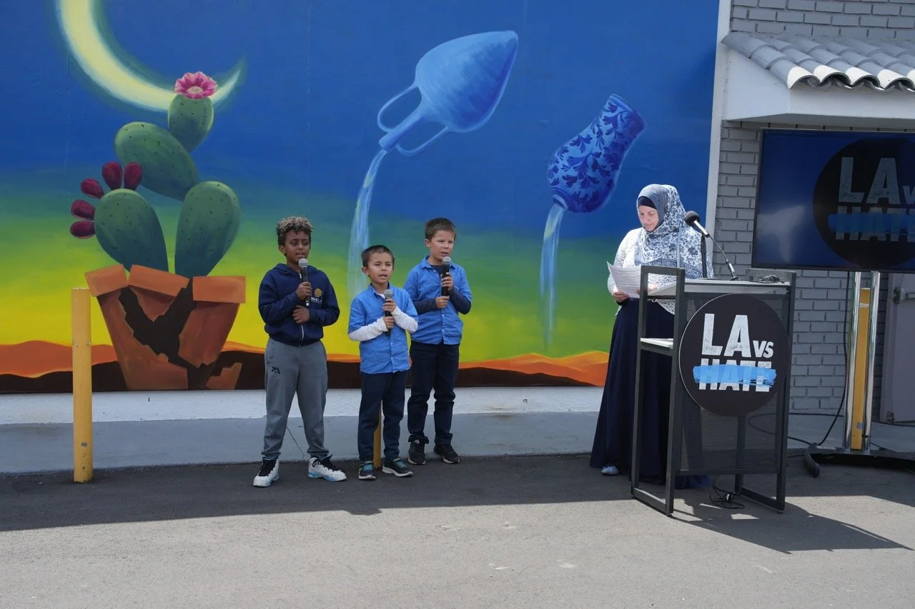 LA vs Hate joined faith leaders, elected officials, artists, and community members at the Islamic Center of Southern California to celebrate the unveiling of a new mural titled “Sabr at Fajr”, created by Palestinian-American artist Saj Issa. The event, hosted by LA vs Hate in partnership with MPAC, CAIR-LA, is part of LA vs Hate’s Signs of Solidarity campaign. Launched in April, Signs of Solidarity is a grassroots initiative aimed at countering rising hate, hostility, and discrimination by distributing community signage—such as yard signs, posters, and murals—to foster a shared neighborhood identity rooted in inclusion and respect for diversity.