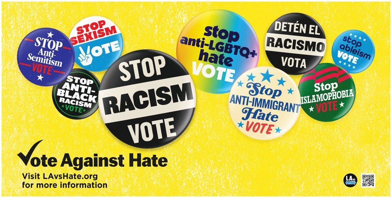 At the ballot box, we hope you consider voting for people and policies that strengthen LA's diverse communities and protect them against hate and discrimination. Everyone should remember voting is a human right and a tool in the fight against hate and discrimination. When we work together against hate, we can restore civil discourse, embrace the strength of diversity, and build inclusive and equitable communities for all.